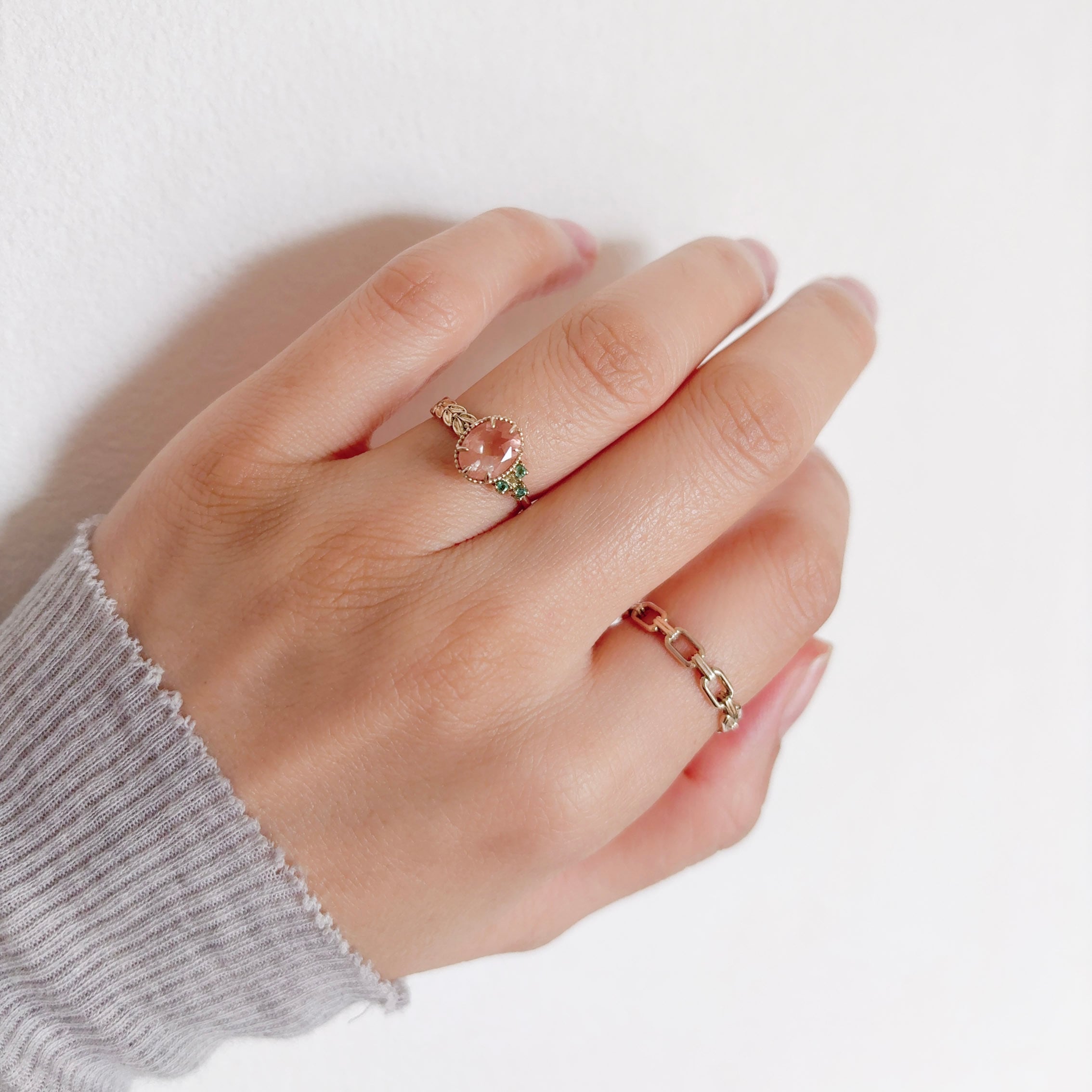肌馴染みの良い優しいピーチピンク色のオレゴンサンストーンに色鮮やかなエメラルドを添えたカラーストーンのリングです。