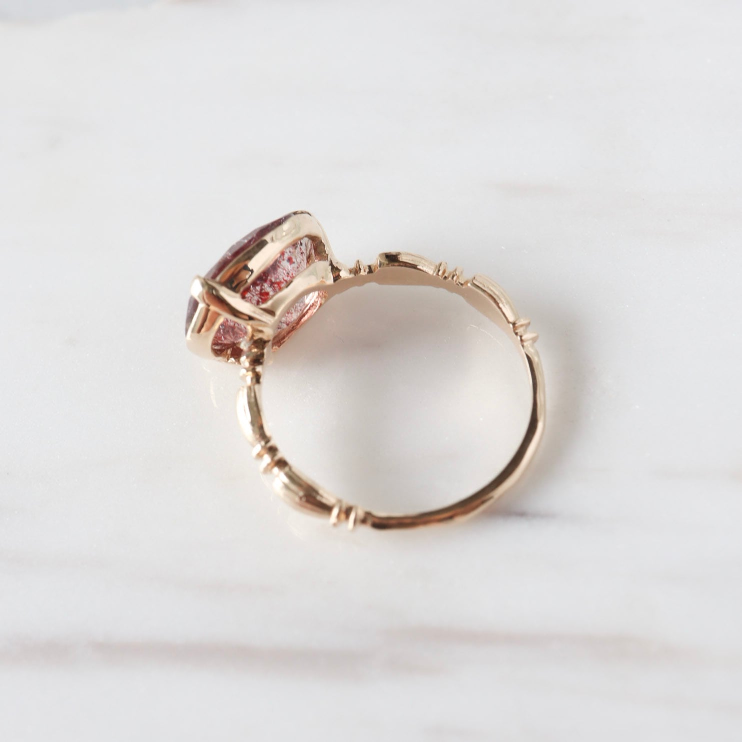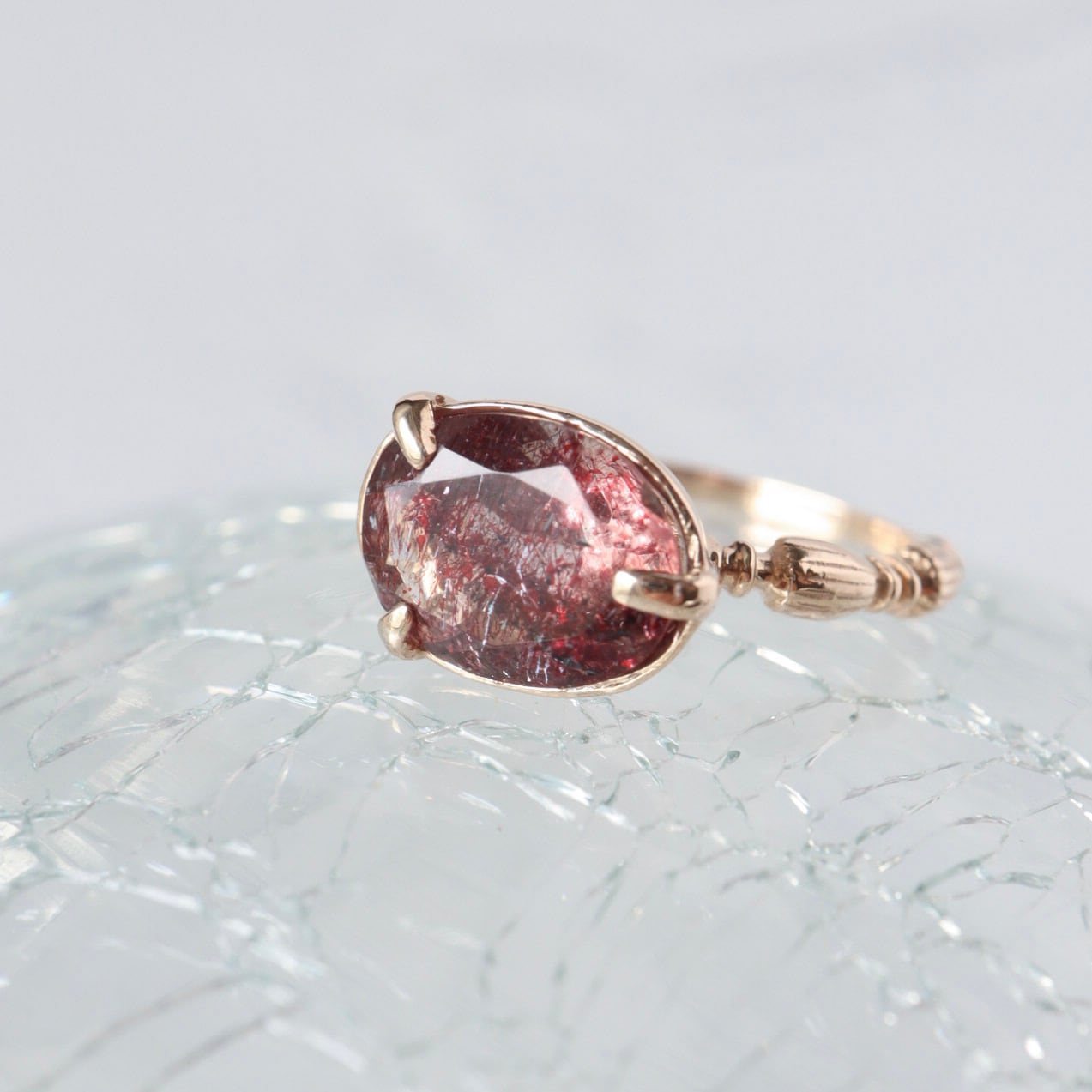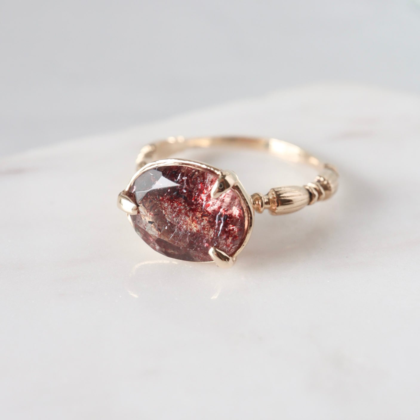 透明度の高いクォーツの中に、深紅や赤褐色の針状のゲーサイト(針鉄鉱)やうろこ状のレピドクロサイト(燐鉄鉱)などのインクルージョンが色鮮やかなスーパーセブンのリング
