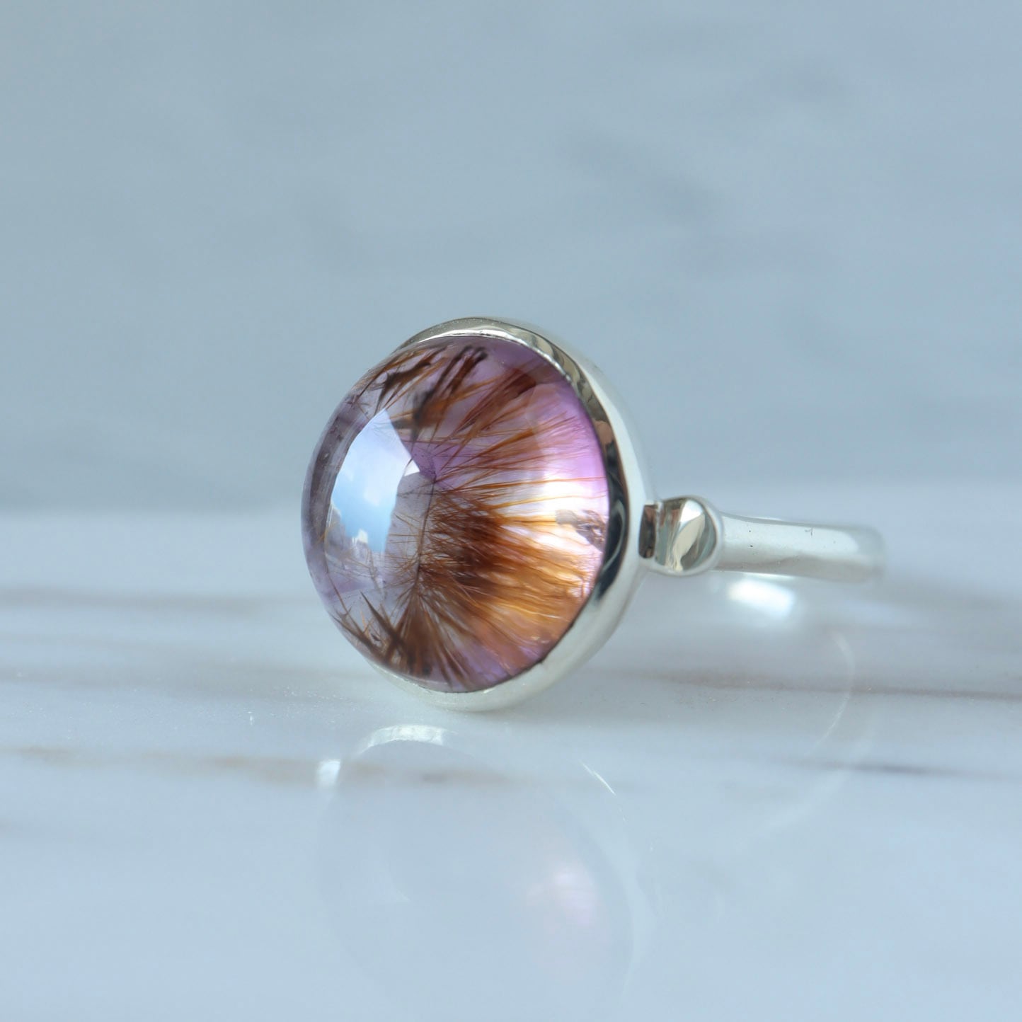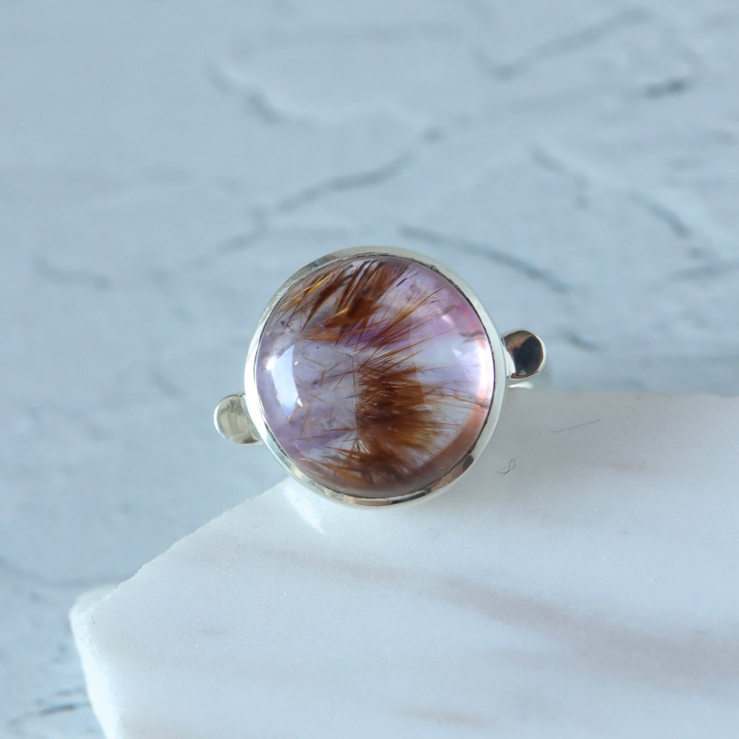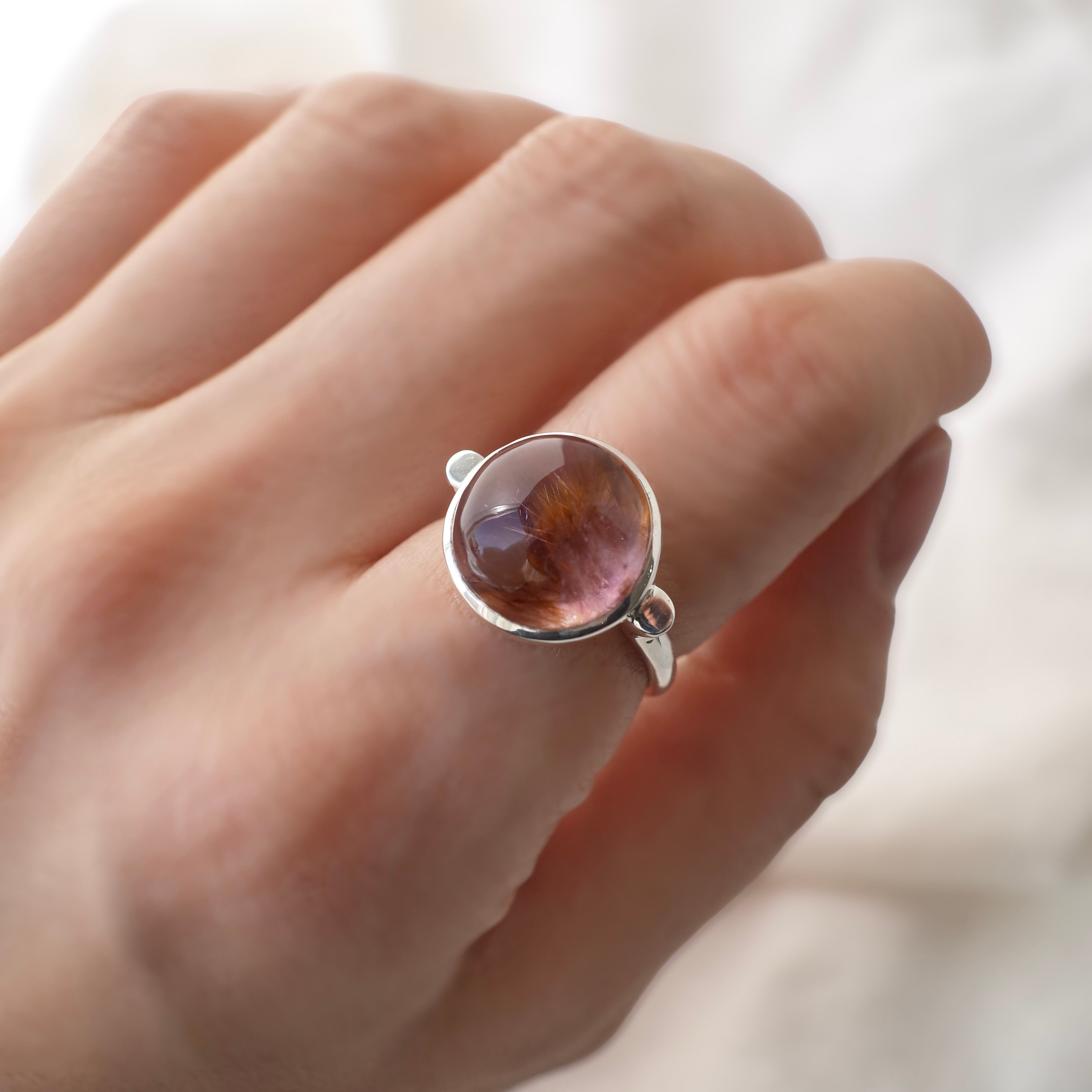 アメシストの中に内包される針状の結晶が印象的なゲーサイトインアメシストのリング