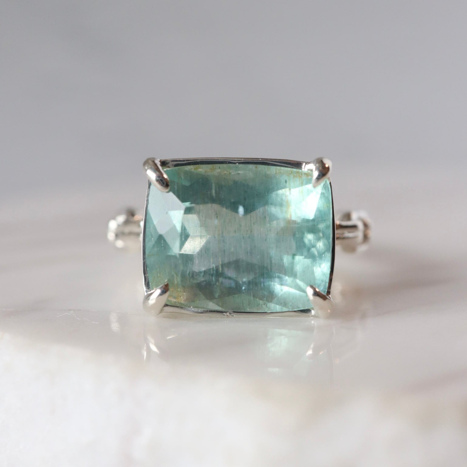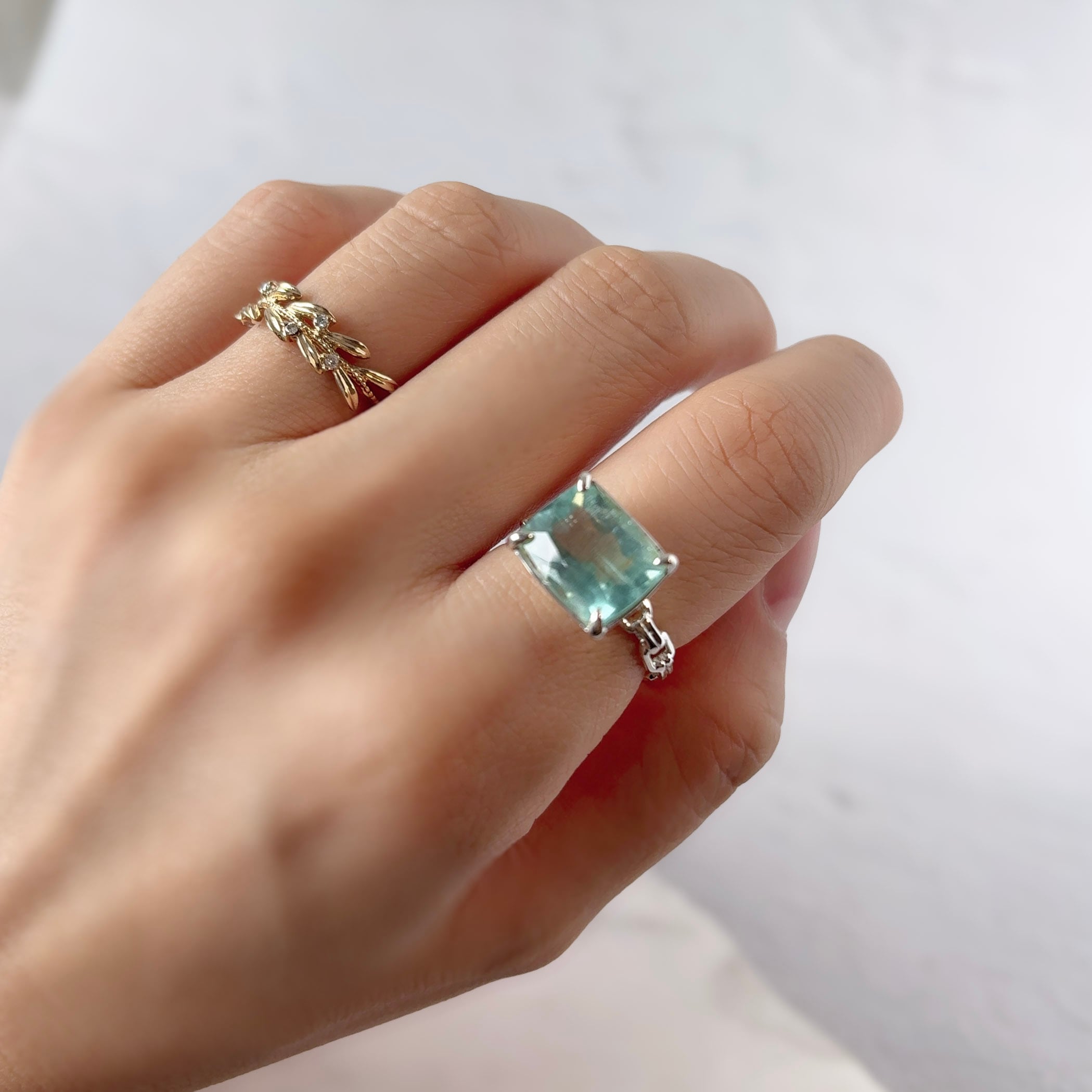 爽やかなブルーグリーンの中に、霧雨が降り注いでいるようなレイン状インクルージョンが特徴的なアクアマリンのリング