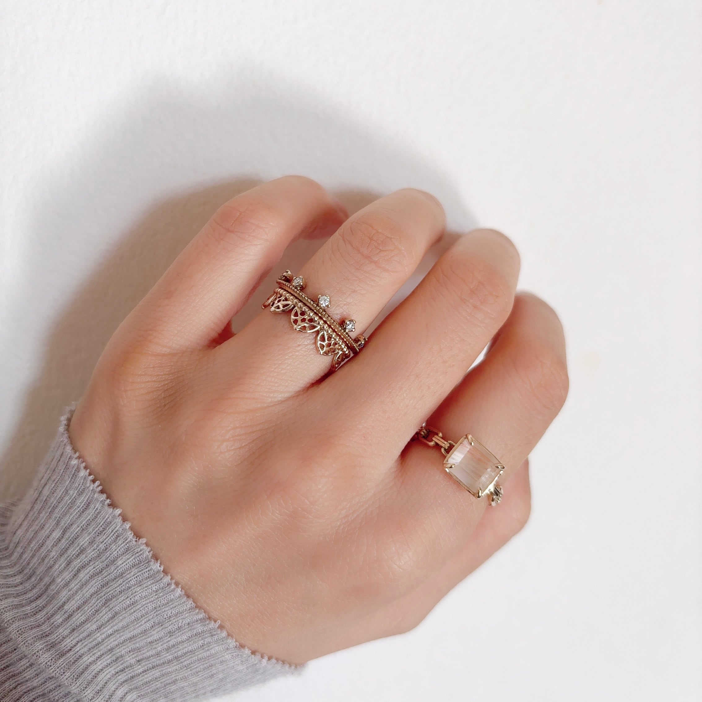 下に向けて着けるとレース模様の女性らしい透かし模様を楽しめるデザインリングです。