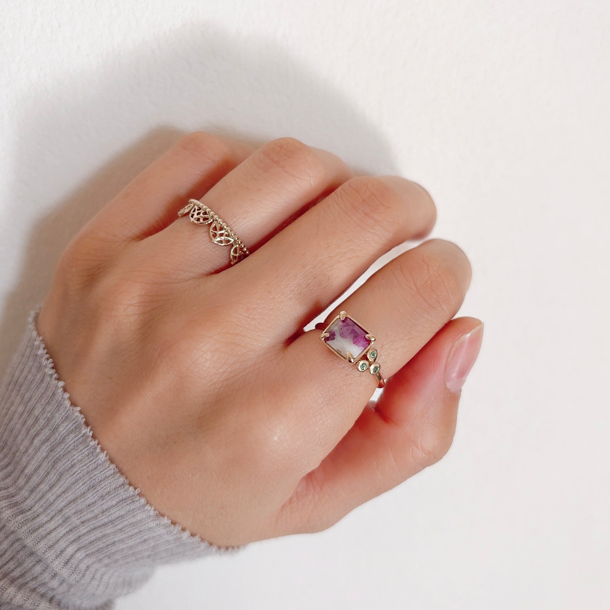 乳白色のクォーツに鮮やかなピンク色のルビーが混ざり合ったルビーインクォーツに片側にだけエメラルドの輝きを添えたアシンメトリーなデザインのカラーストーンリング